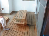 | 露天風呂の準備。まずは床剥がし。 | これが浴槽です。このままだとなんだこりゃ?って感じだね。。。 | 浴槽の照明の配線です。光ファイバーなんだぞ! |